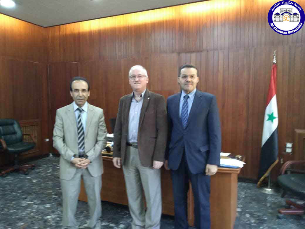 Discussing by Prof. Dr. Muhammad Iqbal Al-Mushrif President of Al-Shahba Private University with Prof. Dr. Maher Karman, President of Aleppo University, in the presence of Prof. Omar Ismail, Vice-President of Al-Shahba Private University, the possibility of signing a scientific cooperation agreement between Aleppo University and Al-Shahba Private University, which includes the fields of research, training, development, exchange of visits and exchange of scientific activity.