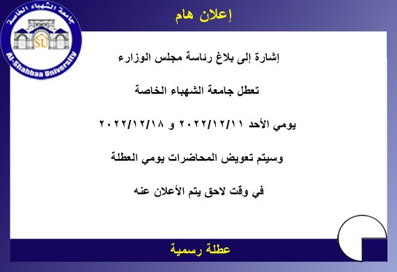 إشارة إلى بلاغ رئاسة مجلس الوزارء تعطل جامعة الشهباء الخاصة يومي الأحد ٢٠٢٢/١٢/١١ و ٢٠٢٢/١٢/١٨ وسيتم تعويض المحاضرات يومي العطلة في وقت لاحق يتم الأعلان عنه