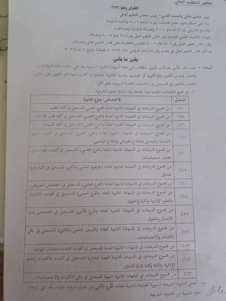 الحدود الدنيا للقبول في جامعة الشهباء الخاصة .... الحد الأدنى لمعدلات القبول في جامعة الشهباء الخاصة والمطلوب للتسجيل على المفاضلة: